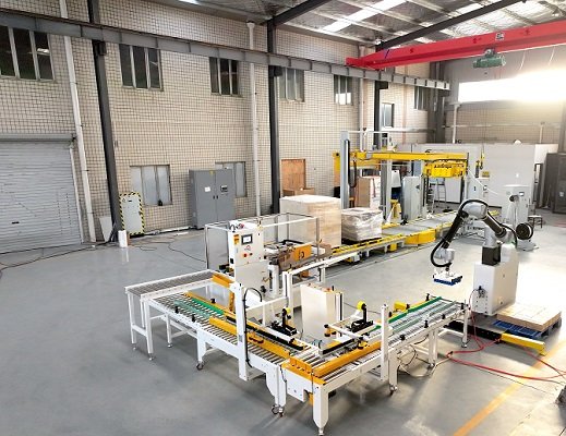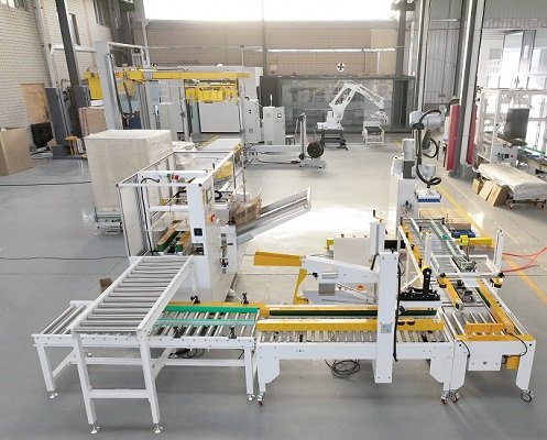 玉米面條十字封箱機是由開箱機、折蓋封箱機、90度轉(zhuǎn)向機構(gòu)、半自動一字封箱機以及協(xié)作機器人碼垛機組成,該線體根據(jù)用戶現(xiàn)場比較緊湊的實際情況而設計,開箱機出料口高度較高,在成品紙箱上面,成品紙箱輸送機2側(cè)坐人進行裝箱,抬手即可拿取空紙箱,大大減少了設備的占地面積,同時方便用戶的實際操作。尾端配備協(xié)作機器人碼垛機,占地面積小,成本低,雙抓設計,工作效率高,特別適用食品類小紙箱的開封箱碼垛包裝。
