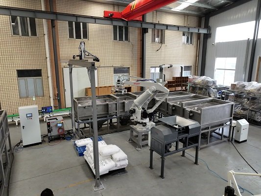 袋子卸垛是目前包裝領(lǐng)域非常常見的一種需求方式,用戶需要對(duì)托盤上的袋子進(jìn)行卸垛,同時(shí)需要將卸下來的袋子進(jìn)行破包,將內(nèi)部物料倒入提前準(zhǔn)備好的料斗里,有可能只有一種物料,有時(shí)也有可能是多種物料按照一定的比例混入料斗中,之后分別輸送到指定位置。而破袋后的袋子,有的需要緩存到其他的料箱中,而有的則需要直接粉碎后,再次回收。