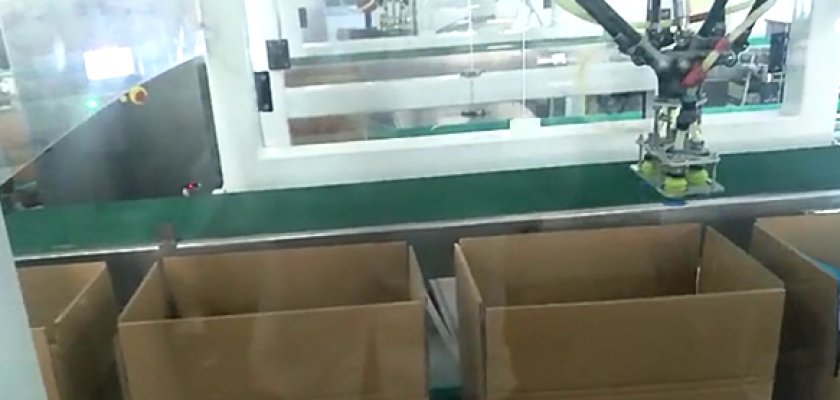 并聯(lián)機器人裝箱機也稱蜘蛛手裝箱機,是一款速度比較快的裝箱機,該機采用PLC控制,配合自動機械手(抓手樣式可選),實現(xiàn)對小物品的自動裝箱作業(yè),主要用于小袋產(chǎn)品或小盒產(chǎn)品的的裝箱,多用于食品、藥品、化工等包裝領域。
